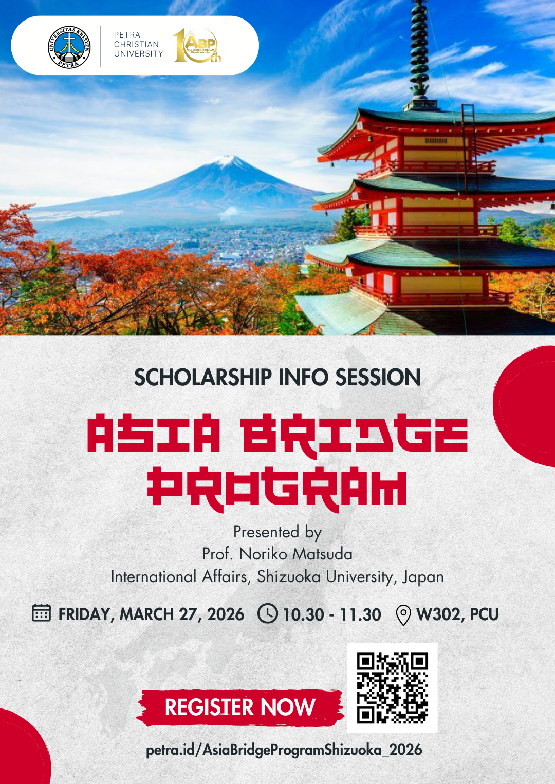 Pada 27 Maret 2026 bertempat di W.302 Gedung Radius Prawiro, Biro Administrasi Kerjasama dan Pengembangan Universitas Kristen Petra Surabaya mengadakan acara Asia Bridge Program. Acara ini adalah sesi informasi studi dan beasiswa di Jepang yang dibawakan Prof. Noriko Matsuda dari International Affairs, Shizuoka University, Jepang.