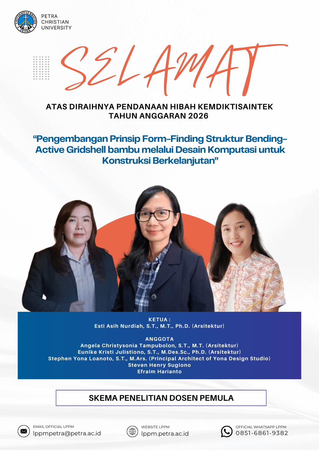 Ucapan selamat atas prestasi yang diraih oleh Esti Asih Nurdiah, S.T., M.T., Ph.D., serta angela Christysonia Tampubolon, S.T., M.T, dan Eunike Kristi Julistiono, S.T., M.Des.Sc., Ph.D. serta Stephen Yona Loanoto, S.T., M.Ars., serta Steven Henry Sugiono, Efraim Harianto sebagai penerima pendanaan hibah Kemdiktisaintek tahun anggaran 2026, dengan skema Penelitian Dosen Pemula
