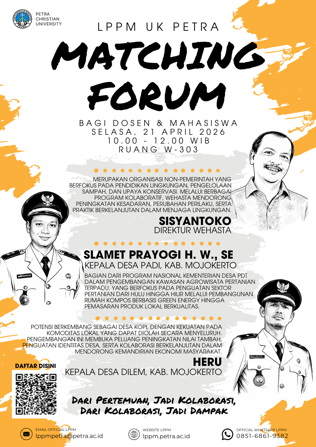 Selasa, 21 April 2026, jam 10.00-12.00 WIB, bertempat di ruang W.303 gedung Radius Prawiro, Lembaga Penelitian dan Pengabdian kepada Masyarakat Universitas Kristen Petra Surabaya mengadakan diskusi dengan topik "Matching forum". Forum diskusi ini akan dihadiri Sisyantoko direktur Wehasta dan Slamet Prayogi H. W., S.E. kepada desa Padi kabupaten Mojokerto serta Heru, kepala desa Dilem kabupaten Mojokerto.