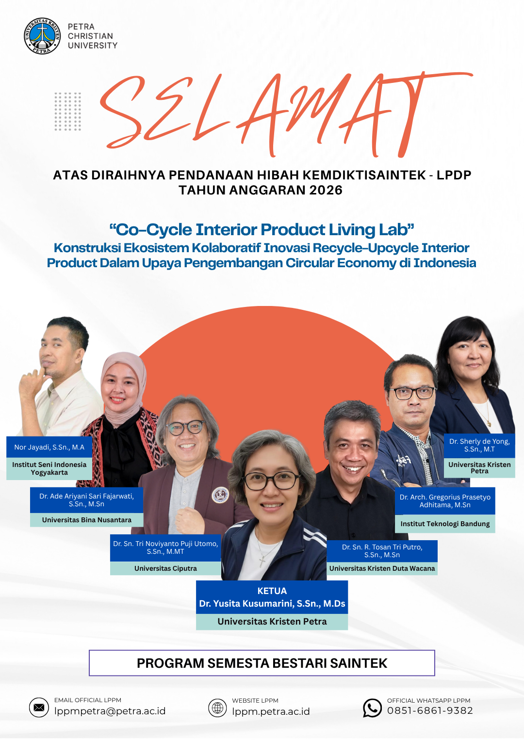 Ucapan selamat atas prestasi yang diraih oleh Dr. Yusita Kusumarini, S.Sn., M.Ds dan Dr. Sherly de Yong, S.Sn., M.T. (dari UK Petra) dan Dr. Arch., Gregorius Prasetyo Adhitama, M.Sn. (dari ITB) dan Dr. Sn., R. Tosan Tri Putro, S.Sn., M.Sn. (dari UK Duta Wacana) dan Nor Jayadi, S.Sn., M.A. (dari ISI Yogyakarta) serta Dr. Ade Ariyani Sari Fajarwati, S.Sn., M.Sn. (dari Universitas Binus) dan Dr. Sn., Tri Noviyanto Puji Utomo, S.Sn., M.MT. (dari Universitas Ciutra) sebagai penerima pendanaan hibah Kemdiktisaintek - LPDP tahun anggaran 2026, dengan skema Program Semesta Bestari Saintek.
