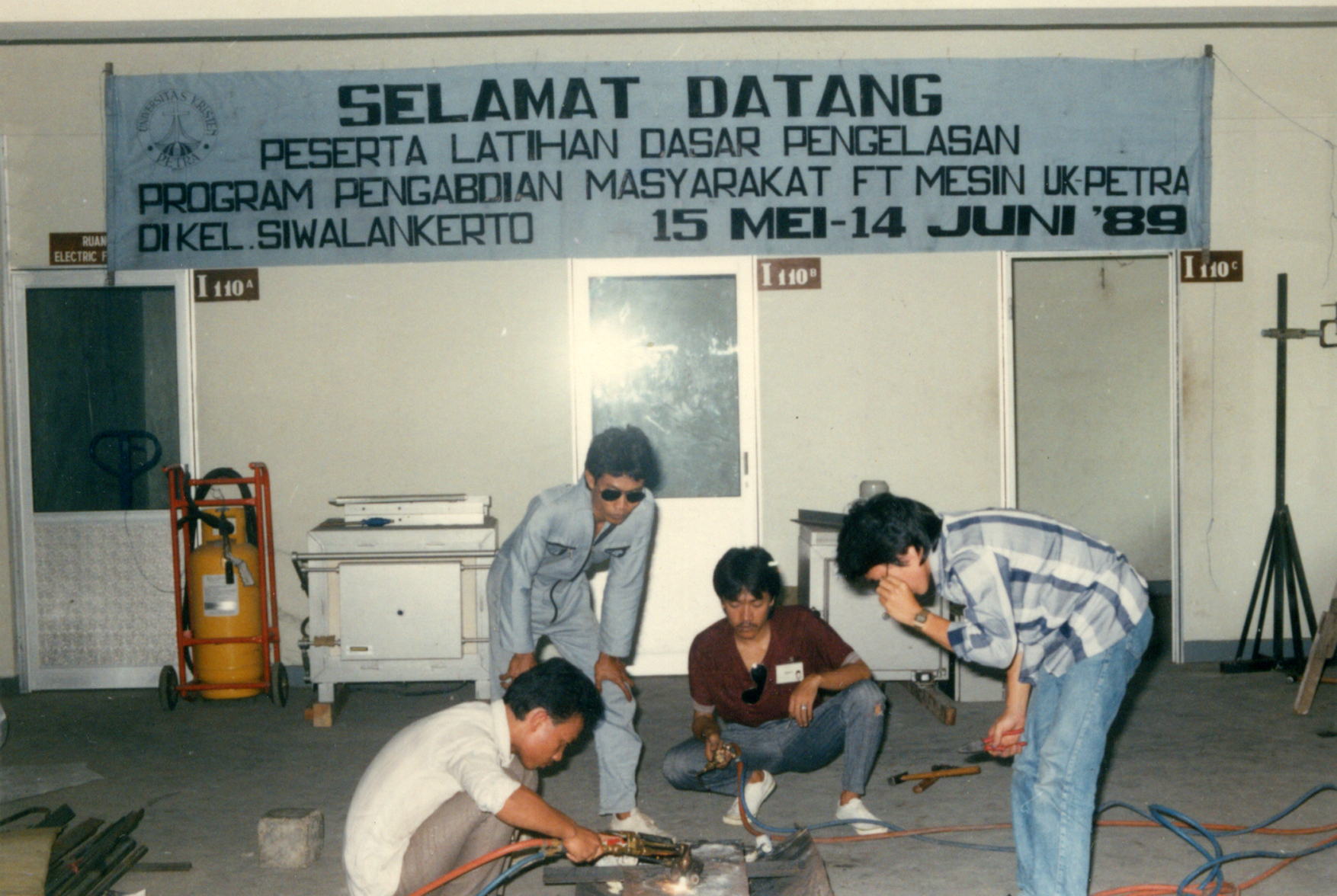 Dokumentasi latihan dasar pengelasan, program pengabdian masyarakat Fakultas Teknik Mesin Universitas Kristen Petra di Kelurahan Siwalankerto Surabaya tanggal 15 Mei-14 Juni 1989.