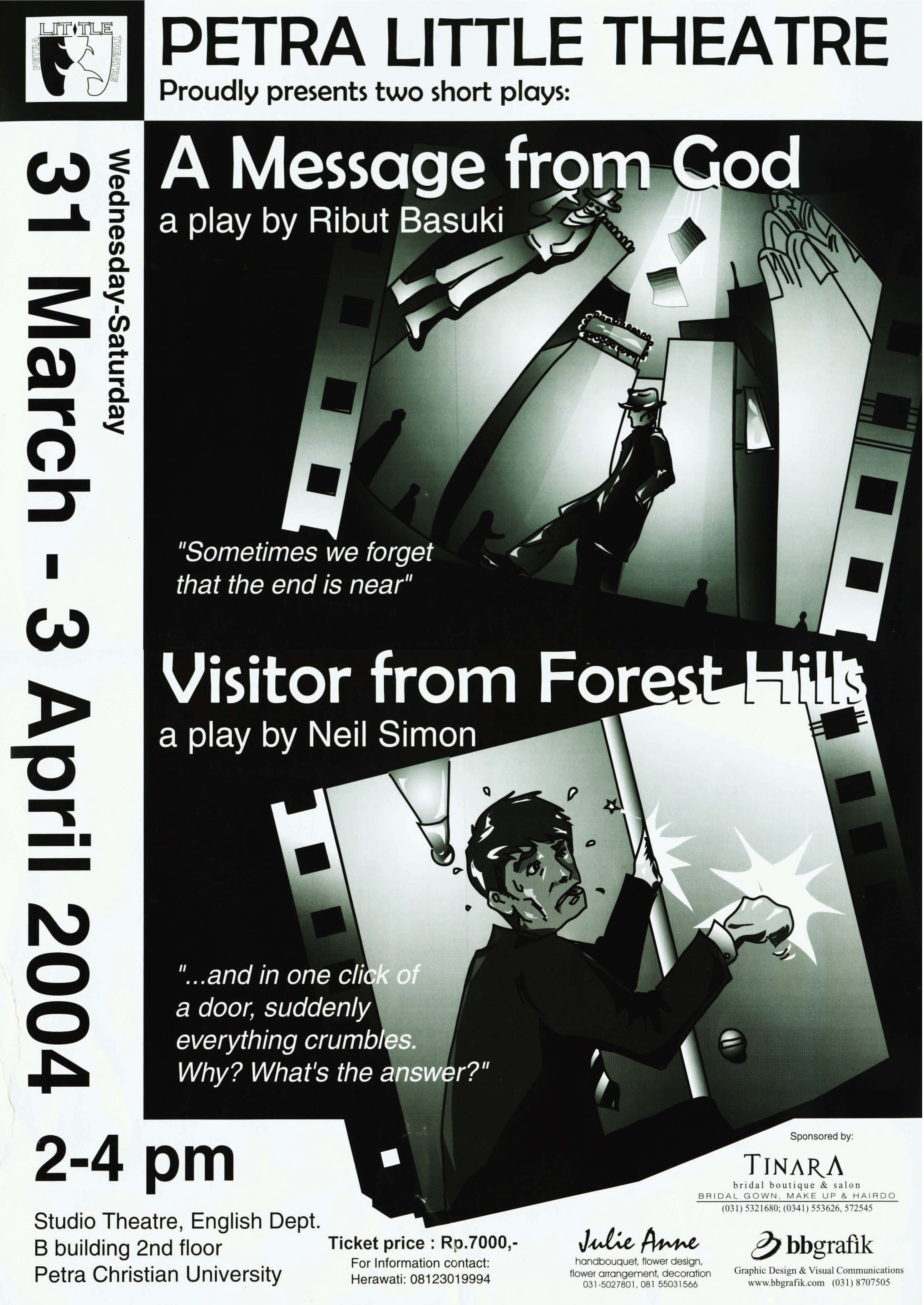Poster pertunjukan teater dengan judul "A Message from God and Visitor from Forest Hills" diadakan oleh Petra Little Theatre di Studio Teater Gedung B lantai 2 Jurusan Sastra Inggris Fakultas Sastra Universitas Kristen Petra pada tanggal 31 Maret - 3 April 2004